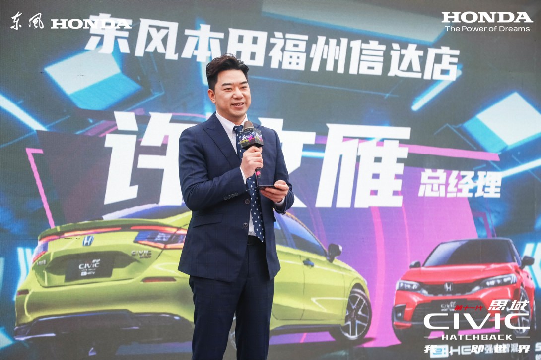 首先東風(fēng)本田福州信達(dá)店總經(jīng)理許文雁先生上臺(tái)進(jìn)行了致辭分享,闡述東風(fēng)本田品牌理念與第十一代思域HATCHBACK的全新變革。